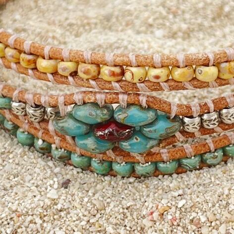 デイリーに、ビーチやリゾートに似合うカジュアルな三連ラップブレス。ラップ部分が細身なので、レザーブレスながらも華奢でフェミニン。